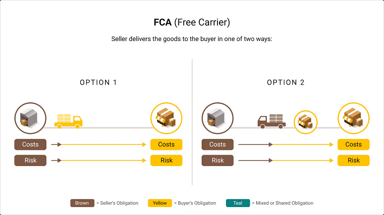 Bajo el Incoterms FCA, el vendedor cumple con su obligación de entrega cuando pone la mercancía a disposición del comprador en un lugar convenido, según en el medio de transporte elegido por el comprador (camión, contenedor marítimo, avión, etc.). A partir de ese momento, la responsabilidad sobre la mercancía y los riesgos asociados recaen sobre el comprador.